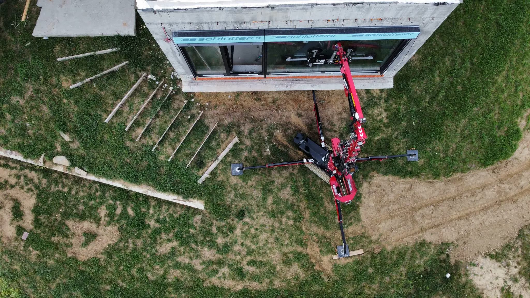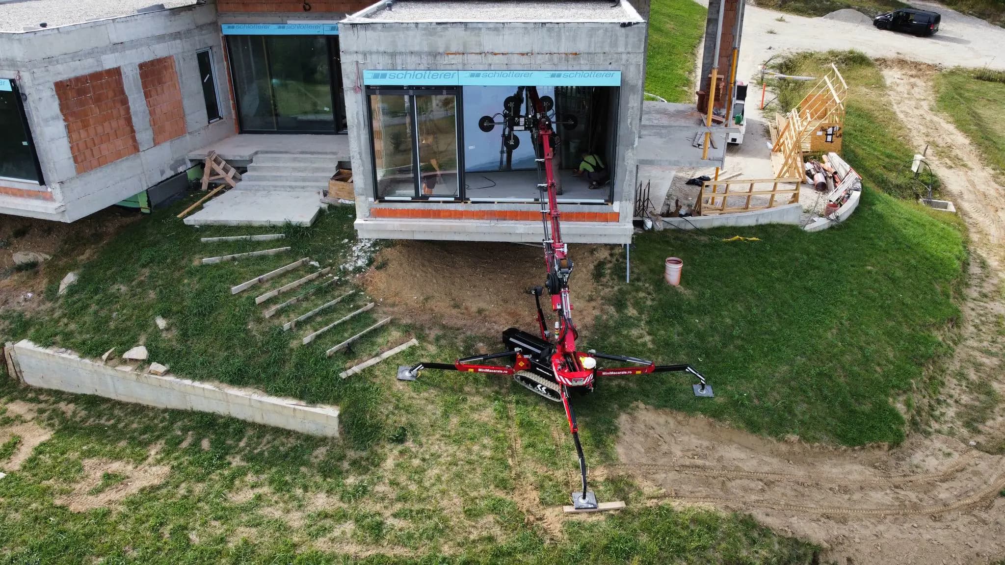Una instalación de vidrio impecable en Rumania con el Hoeflon C6e de Minimacarale. El posicionamiento flexible en esta pendiente y el manejo sencillo y preciso garantizan una instalación del vidrio sin esfuerzo.
