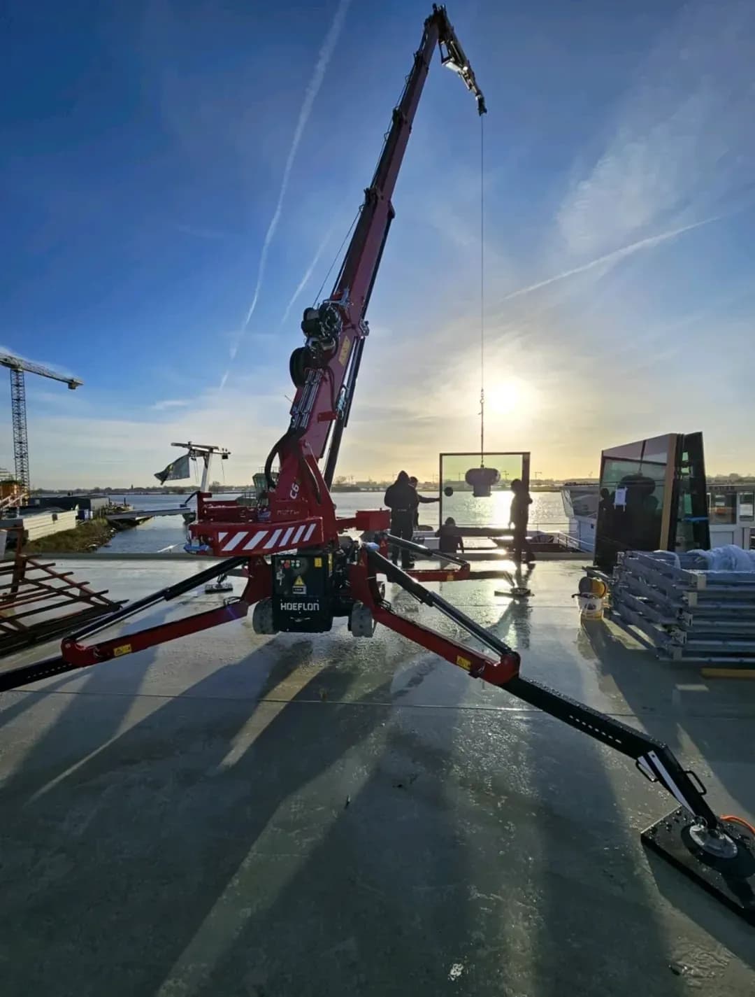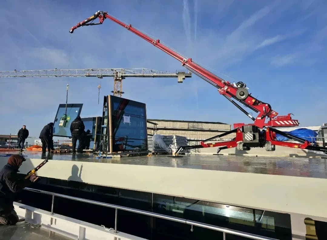 La minigrúa compacta fue la solución ideal. Gracias a su configuración flexible y controles precisos, los paneles pudieron elevarse con seguridad y precisión hasta su ubicación. El resultado: una apariencia elegante y moderna para los barcos.