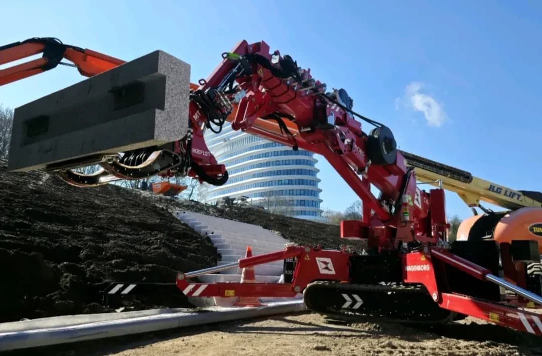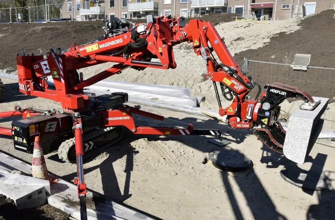 Durante la construcción de un túnel para bicicletas, Wagenborg Nedlift se enfrentó al reto de mover e instalar con precisión elementos pesados de piedra natural de aproximadamente 250 kg. Para esta tarea especializada, se seleccionó la Hoeflon C10e, combinada con la multiherramienta y la multigarra.