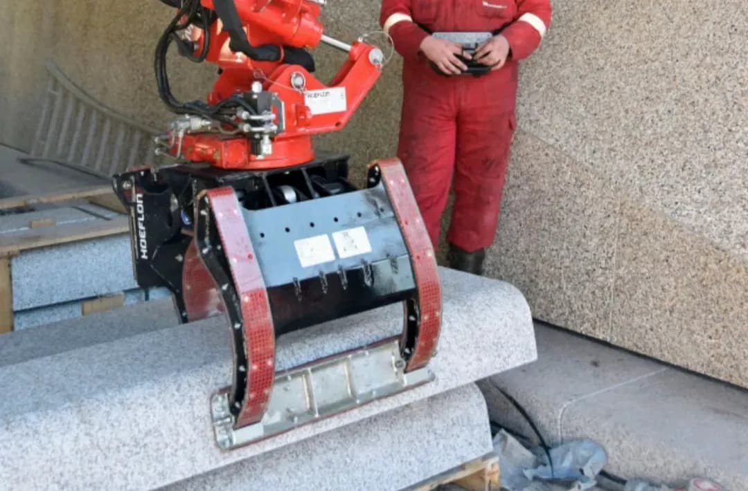 El Hoeflon C10e con multiherramienta y multigarra demostró su precisión y resistencia al colocar piedra natural para un túnel de bicicletas.